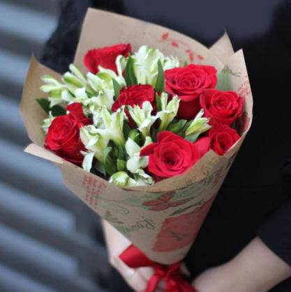 Букет из роз и альстромерий в стильной упаковке