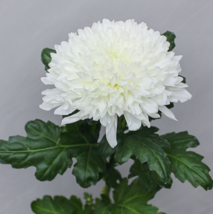 Белоснежный сорт одиночных хризантем, соцветие полушаровидное. Кусты прочные, с темно-зелеными хрустящими листьями, высотой 0,9 м. Имеет высокий стебель высотой примерно 70-80 см, на котором расположен махровый цветочный купол белого цвета. Диаметр полностью раскрытого цветка составляет около 15 см. Данные цветы отличаются стойкостью и шикарным видом.